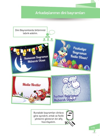 Arkadaşlarımın dini bayramları Dini Bayramlarda birbirimizi tebrik edelim. Buradaki bayramları dinlere göre ayıralım, ortak ve farklı yönlerini gösteren bir afiş hazırlayalım. 115